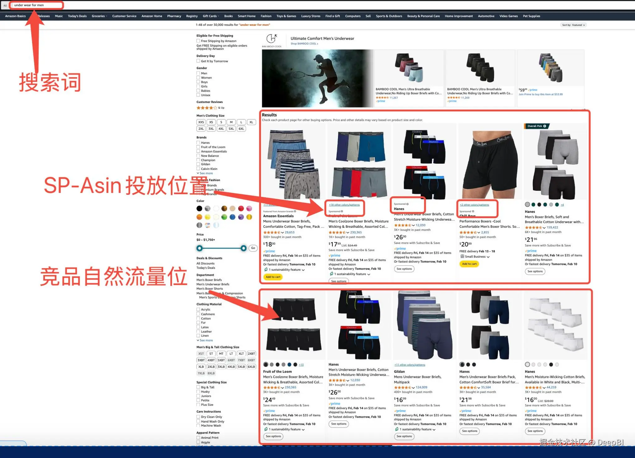 用户搜词(如 “underwear for men”),你的ASIN广告抢占竞品自然位上方!转化力强=坐收流量。