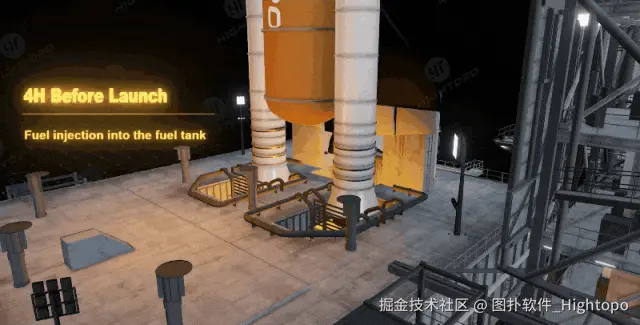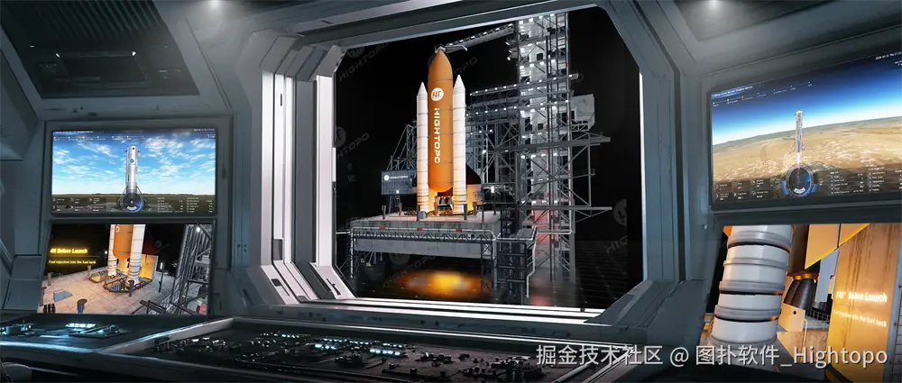 基于 HT 强大的 3D 渲染引擎,构建航天飞机的外燃料箱、固体火箭助推器及发射台 1:1 数字孪生模型,通过厘米级建模精度还原航天飞机独特的组合体结构、发射设施及周边环境细节,以沉浸式指挥环境,使指挥人员突破物理距离限制,实现跨地域协同决策。