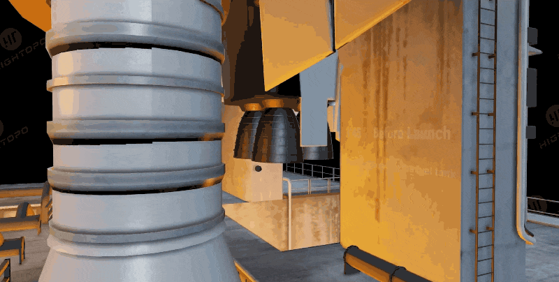 2D 页面的倒计时归零后触发发射指令,火箭发动机点火,产生强大的推力,使航天飞机离开发射台,开始升空。页面内火焰动态效果采用 HT 粒子技术模拟,配合机体震动的细节渲染,为观众带来极具沉浸感的发射体验。