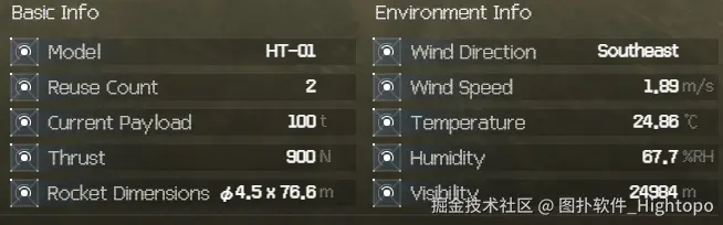 图扑软件采用 HT for WebGIS 技术,融合高清卫星影像与三维实景建模,1:1 复现发射场地形地貌、塔架布局及周边环境,实现地理空间精准映射。同时,动态环境模型实时整合风速、温度等气象数据,为火箭回收路径规划提供精确空间参照。