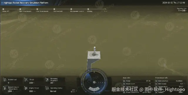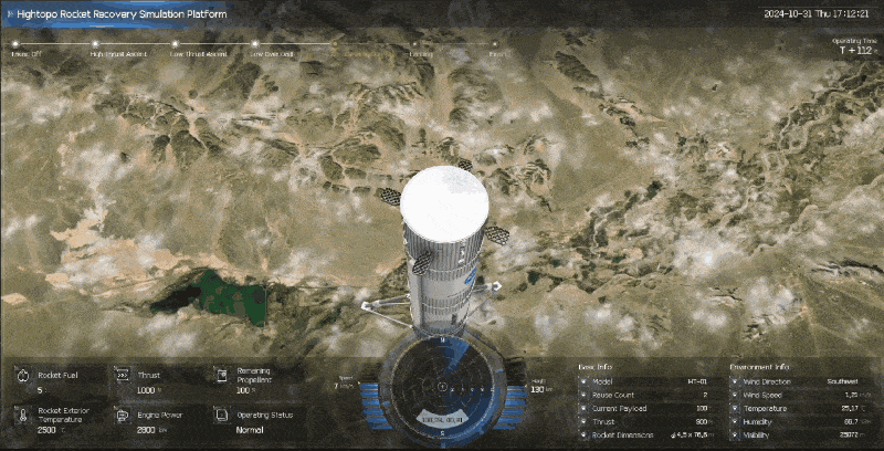 全景态势面板: 火箭型号、复用次数、当前运行阶段、回收进程节点、剩余推进剂、火箭外部温度、当前载荷等基本信息。