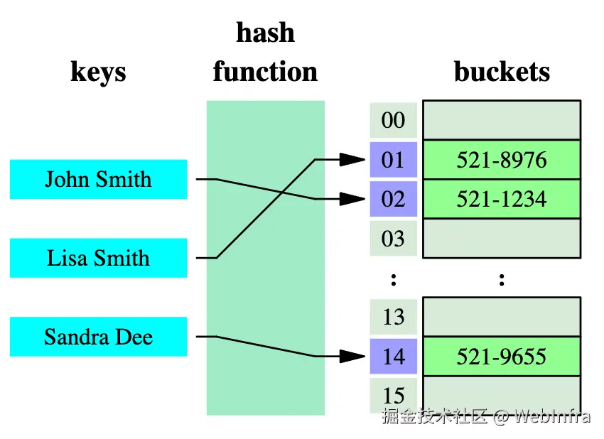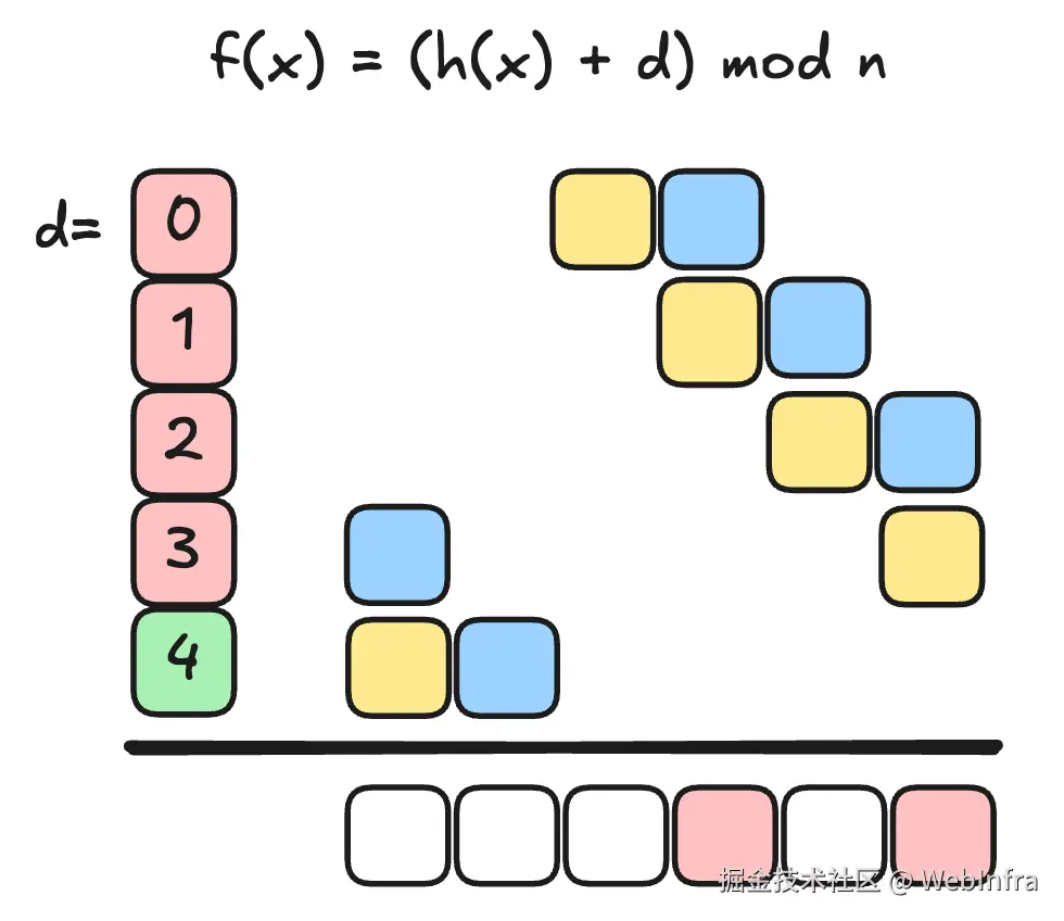 - 当 key 发生冲突时,不像典型的 hashmap 使用 bucket 同时容纳多个 key