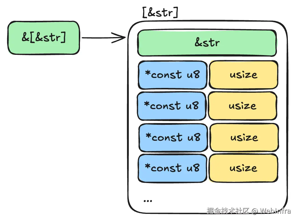 这意味着 &[&str] 中,每个字符串要有 16byte 的额外体积占用。