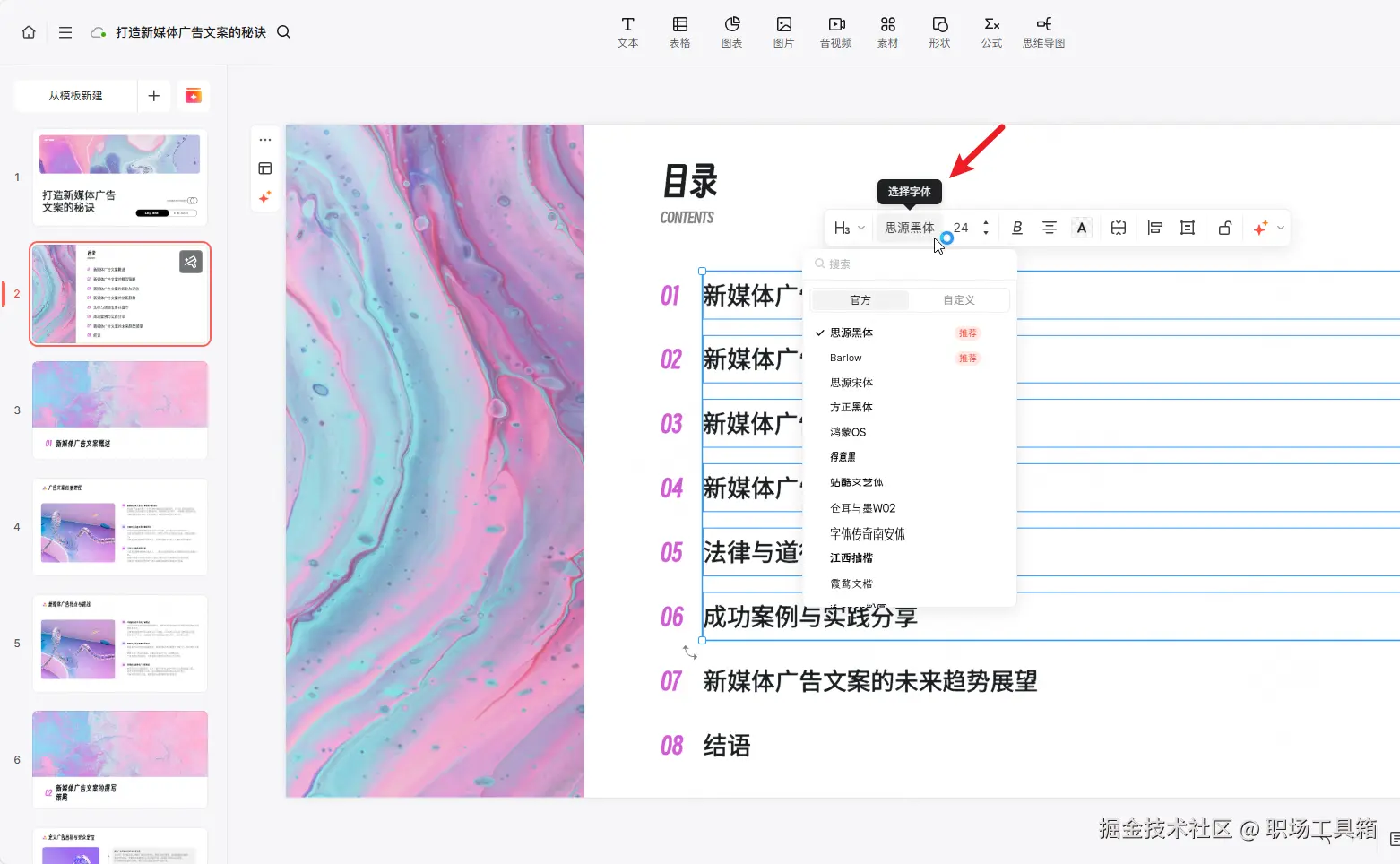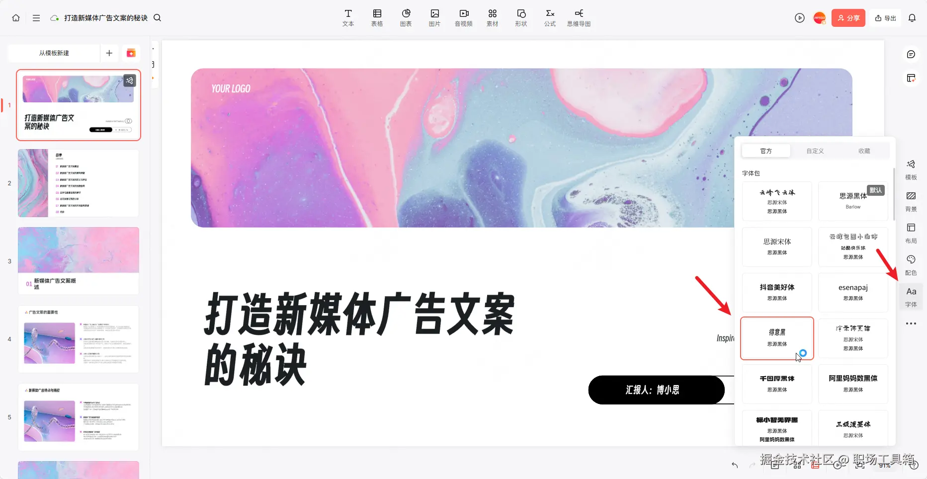 值得一提的是,博思AIPPT内置了多款开源免费字体,包括思源黑体、思源宋体、阿里巴巴普惠体、得意黑体等热门字体。这些字体不仅免费使用,还具有良好的版权保障,企业用户可以放心使用而不必担心版权纠纷。