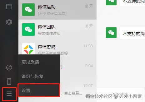 4,有两个必填的格子,首先要把【微信数据文件夹】这个格子填上,电脑登录微信后,点击电脑端微信的【菜单】-【设置】