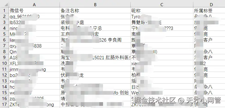 十,表格包含了 微信号、昵称、备注名、备注手机号、备注描述、个性签名等内容,对数据备份来说,非常实用