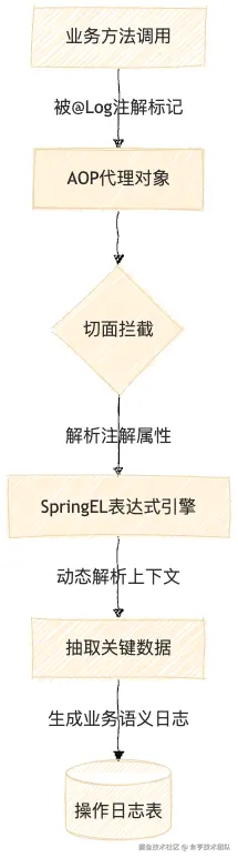 核心原理 通过自定义注解标记需记录日志的方法,利用AOP拦截方法执行,结合SpringEL动态解析操作上下文(如方法参数、返回值)