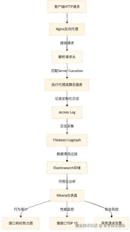 核心原理 通过Nginx定制化日志格式记录HTTP请求(如URL、方法、状态码),结合ELK等工具分析操作模式
