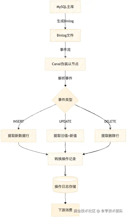 核心原理 监听数据库二进制日志(Binlog),解析INSERT/UPDATE/DELETE事件并转换为操作记录