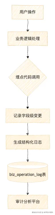 - 核心原理 在业务逻辑中显式调用日志接口,通过硬编码,直接写入结构化操作记录表(如 biz_operation_log)。