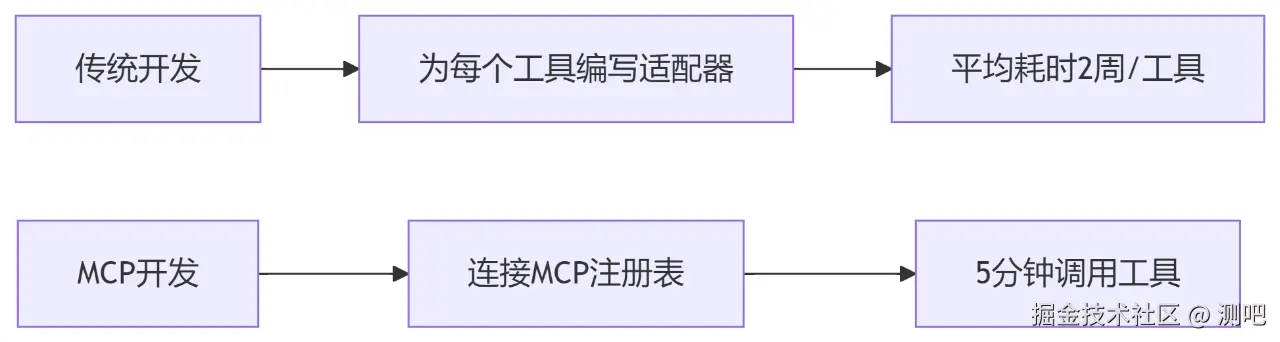 传统集成之痛:过去每对接一个新工具(如数据库、API),开发者需重复编写定制代码,平均耗时2周/工具,且扩展性差、管理混乱。