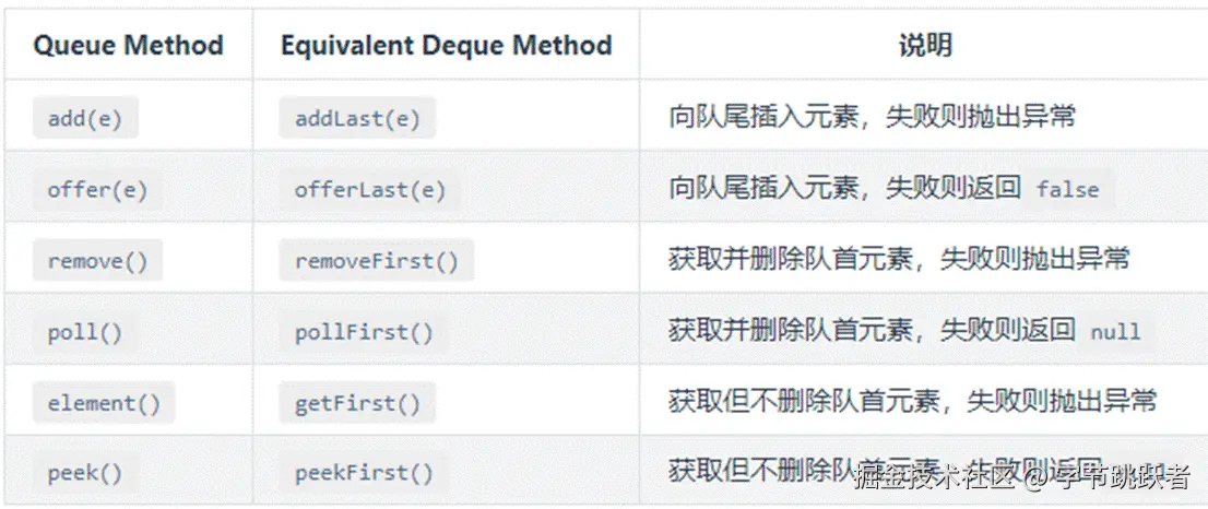 Deque的含义是“double ended queue”,即双端队列,它既可以当作栈使用,也可以当作队列使用。下表列出了Deque与Queue相对应的接口: