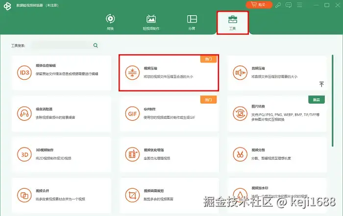 Step1:点击进入数据蛙视频转换器之后,默认会进入【转换】界面,我们申请点击上方选项卡的【工具】选项卡,然后点击 【工具】 列表的 【视频压缩】 功能。