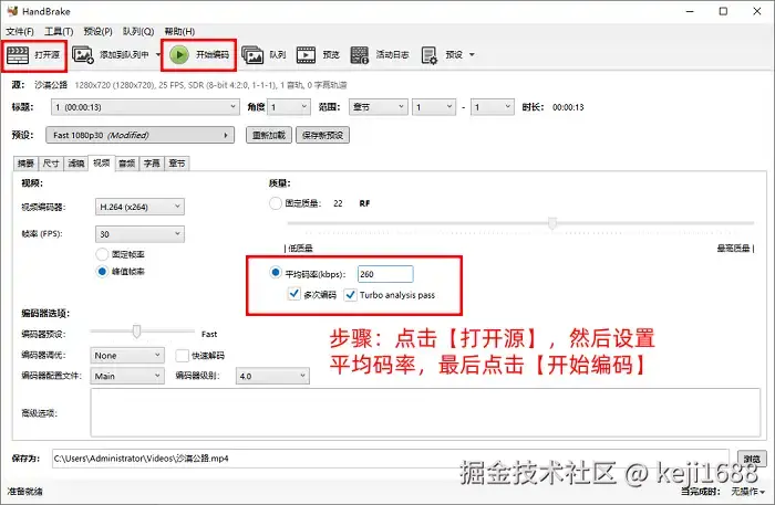 操作步骤:点击进入HandBrake之后,点击【打开源】并导入我们所需要转换的视频素材,点击设置平均码率值,然后点击【开始编码】,等待输出完成便可。