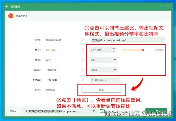Step4:然后,我们也可以点击更改输出视频素材文件的分辨率,以此进一步压缩视频。设置好众多参数之后,请点击 【预览】 ,通过预览效果进一步决定是否重新设置参数。