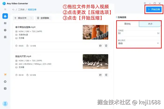 操作步骤:点击进入软件,点击【添加文件】或是直接将我们所需要的视频文件拖动进来,然后选择好【压缩选项】,最后点击【开始压缩】。