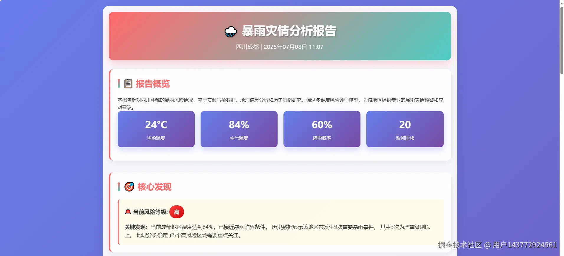 最近,我们尝试用技术回答这些问题 —— 基于 “成都暴雨” 案例,制作了一个整合实时数据、地理信息和历史案例的 HTML 页面。从数据采集到可视化呈现,每一步都藏着对 “暴雨图景” 的拆解与重构。今天,就来聊聊这个页面背后的逻辑与故事。