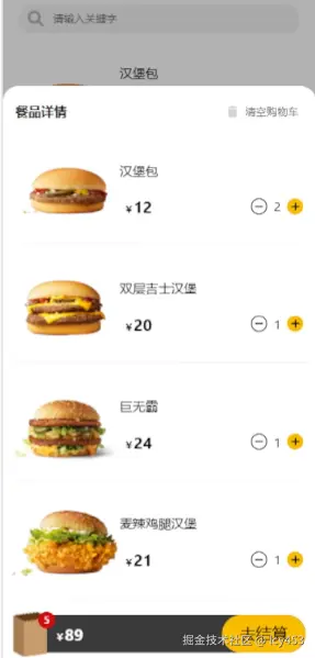 现在我们添加的显示详情以及结账页的显示隐藏,依旧设置state去控制,然后添加点击事件,点击购物车组件显示详情,点击按钮显示支付组件。这里我们先去写详情页面。首先详情页面有一个模态框,也就是点击情况购物车需要弹出一个提示框。