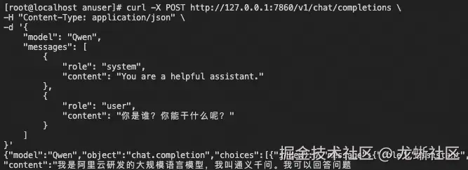 b. 在 TDX 实例或同网络内的其它机器打开新的终端,输入下列命令即可成功调用推理服务 API。