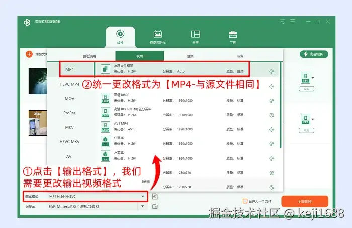 Step3:在调节好每个视频的压缩效果之后,点击 【输出格式】 ,将输出视频的格式统一修改为 【视频-MP4-与源文件相同】 ,即便源视频文件的格式不是mp4,为了视频格式的兼容性,也尽量修改为mp4格式进行输出。