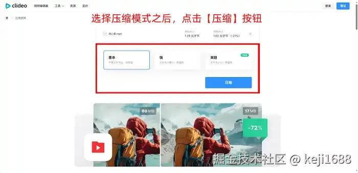 点击【Choose File】,然后上传你所选择的单个视频文件,然后在【基本压缩】【强压缩】和【高超压缩】3种压缩模式中选择一种压缩模式,点击【压缩】。