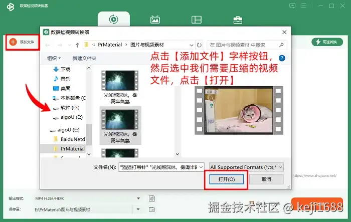 Step1:点击进入数据蛙视频转换器,然后来到 【转换】 页面,点击 【添加文件】 ,将我们急切需要压缩的视频内容点击进行选中之后,点击 【打开】 进行导入。
