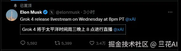 埃隆·马斯克今日宣布,将于北京时间(UTC+8)周四上午 11:00 通过 X 平台直播[1]发布 Grok4。