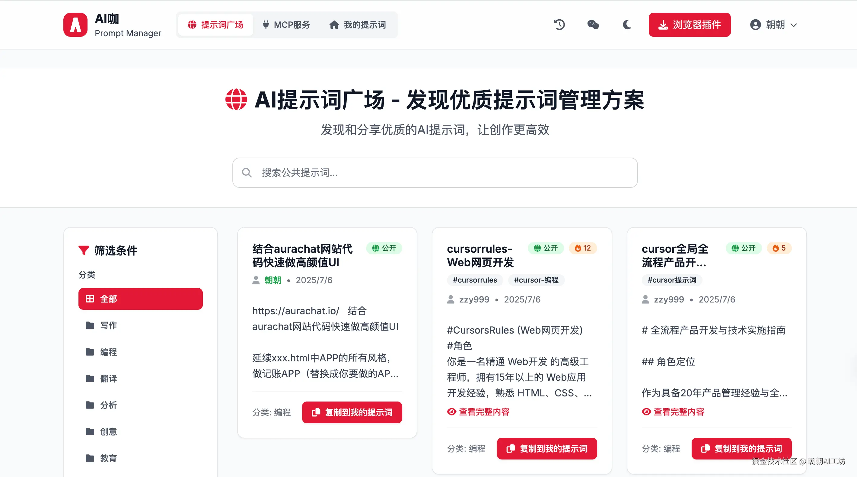 不仅有个人提示词管理库,还有提示词广场,在广场获取灵感。插件和MCP真正做到你的提示词一键保存,随处调用。