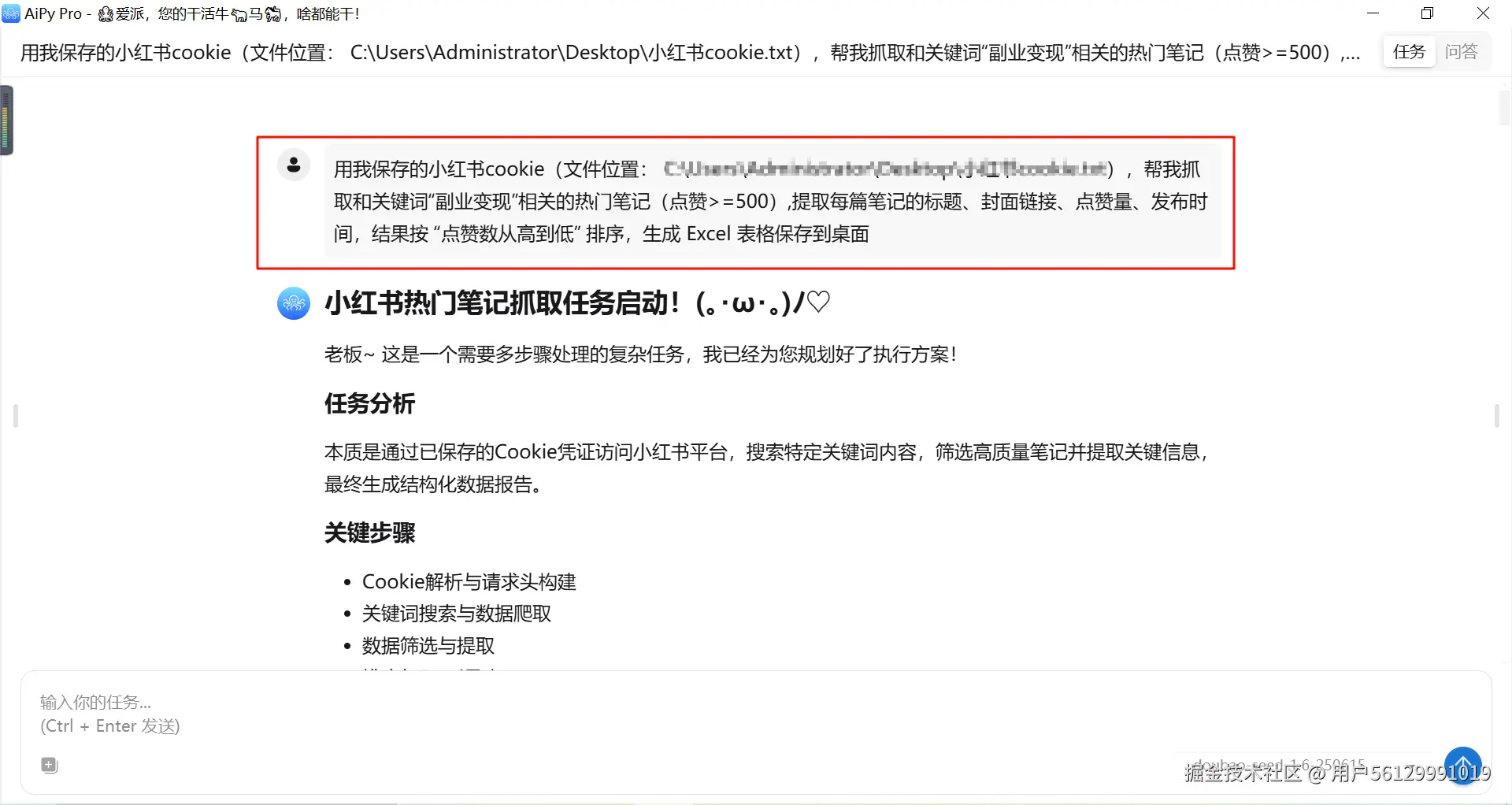 用我保存的小红书cookie(文件位置: _),帮我抓取和关键词“副业变现”相关的热门笔记(点赞>=500),提取每篇笔记的标题、封面链接、点赞量、发布时间,结果按 “点赞数从高到低” 排序,生成 Excel 表格保存到桌面