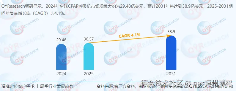 根据QYResearch最新调研报告显示,2024年全球CPAP呼吸机销售额达29.48亿美元,2025-2031年CAGR为4.1%。增长动力主要来自: