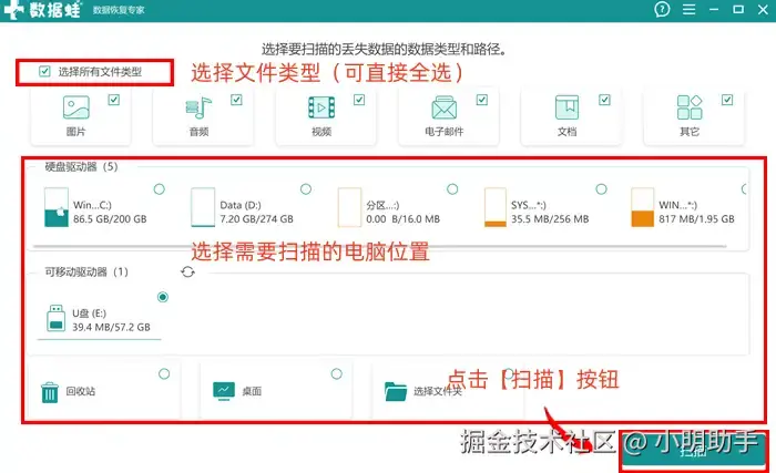 第1步: 打开软件进入到扫描文件准备页面,根据需要找回的文件,选择类型和扫描的位置,选择好后再点击右下角的【扫描】;