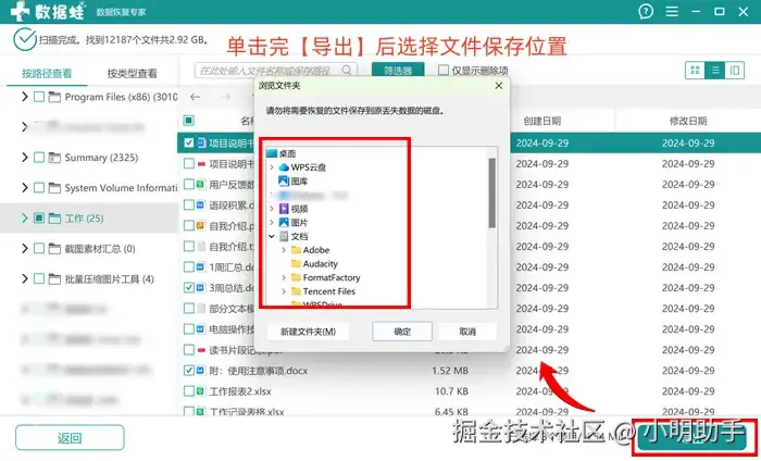 第2步: 在扫描完成后,我们就可以在软件展示的文件中挑选出自己所需的文件;找到后点击表示文件勾选,点击【导出】让文件安全回家;