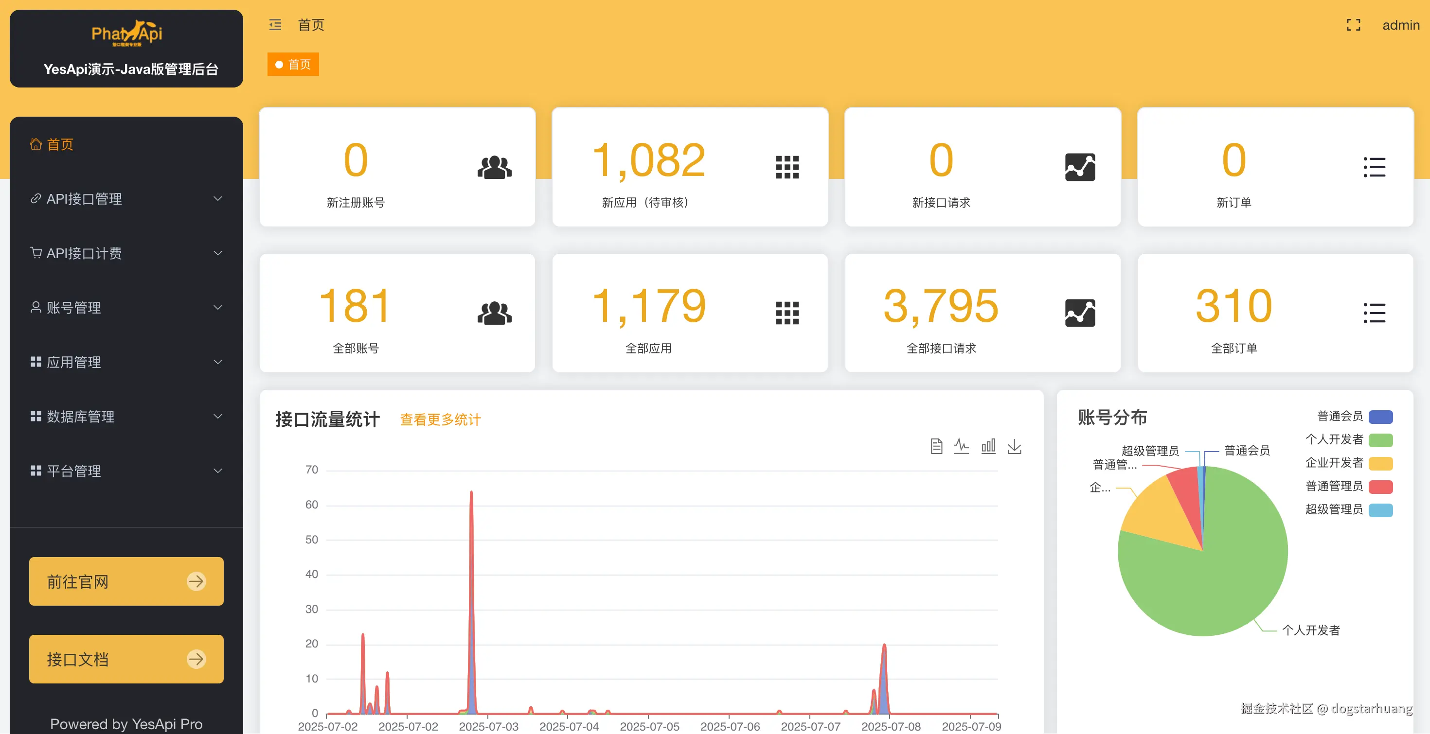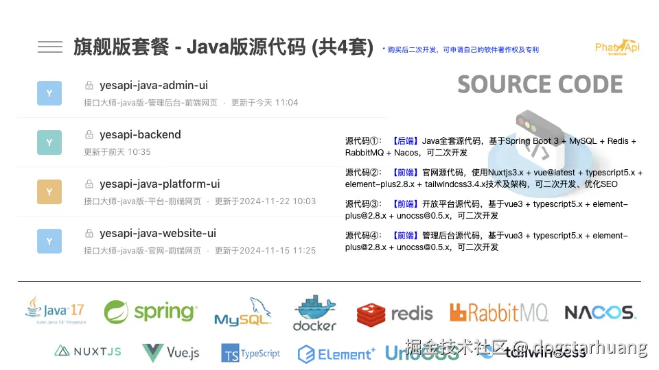 YesApi Pro Java版采用Java+MySQL+Vue3+Docker技术栈,具有专业可靠、易于扩展的特点,特别适合中小型企业和开发团队使用。该平台包含平台官网、API接口、管理后台和开放平台等多个子系统,为企业提供全方位的API管理解决方案。