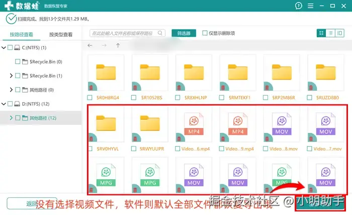 步骤2: 在扫描工作完成后,我们可以在左边的目录选择自己习惯的分类标准,从小类或位置中缩小范围, 找到自己珍贵但被遗失的视频,勾选后点击【导出】的按钮;