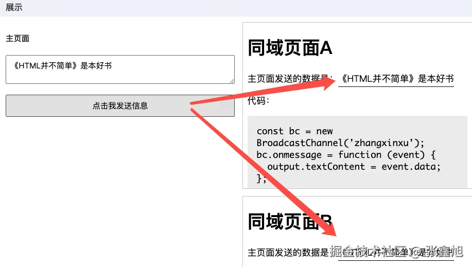 更多内容可以参阅此文:“Broadcast Channel API简介,可实现Web页面广播通信” —— www.zhangxinxu.com/wordpress/?…