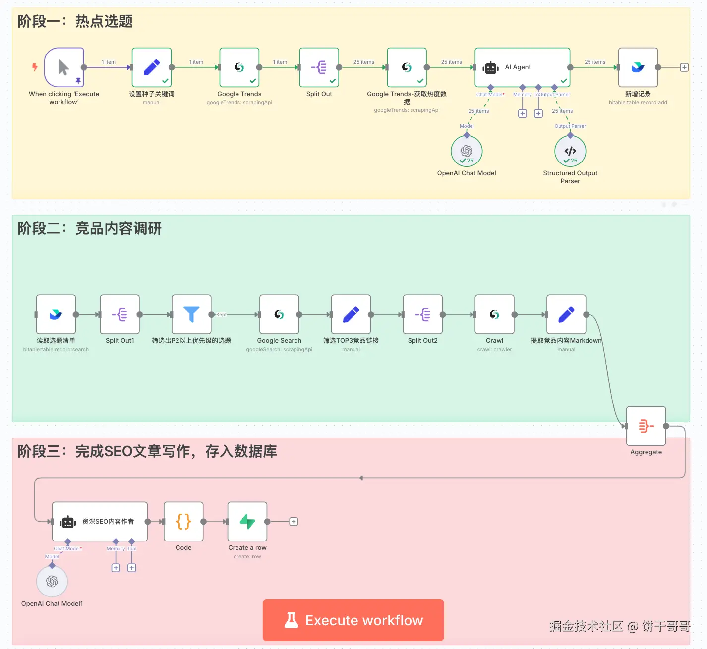 下图就是我们最终要搭建的自动化工作流,它分为三大阶段:热点选题 -> 竞品调研 -> SEO文章写作。