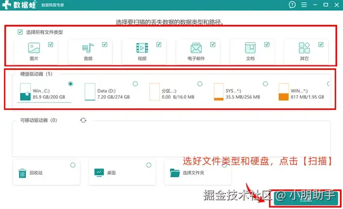 步骤1: 打开软件首页,在上方位置,根据指示选择文件的类型,再选择已经进行格式化了的硬盘后,点击【扫描】按钮让软件开始扫描工作;