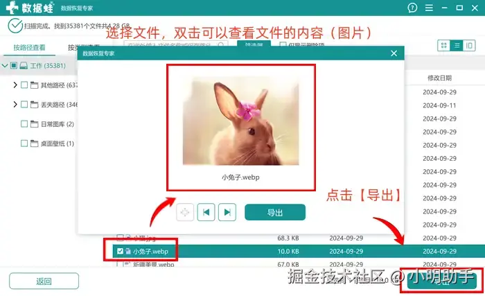 步骤2: 在扫描出来的文件中,选中自己的目标文件,点击【导出】;