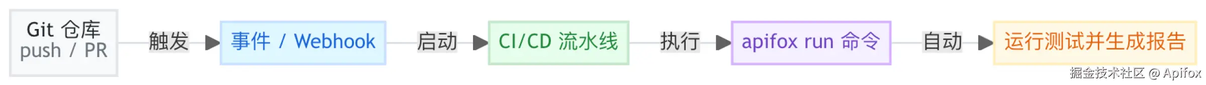 当你把代码推送到 Git 仓库时,CI/CD 平台会监听到这个 Git 事件,然后根据你预设的配置(如流水线脚本、配置文件)自动执行 Apifox 的测试命令。
