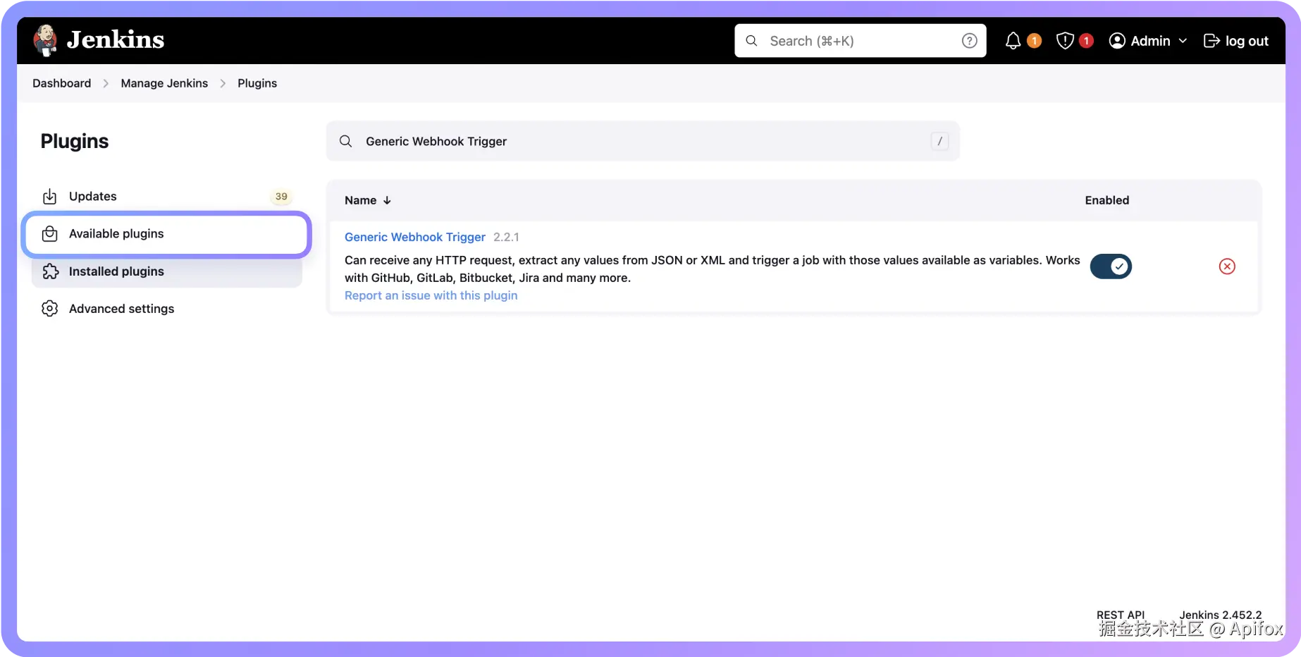 最简单的方法是安装 "Generic Webhook Trigger" 插件。在 Jenkins 的插件管理页面搜索安装,重启后就可以使用了。
