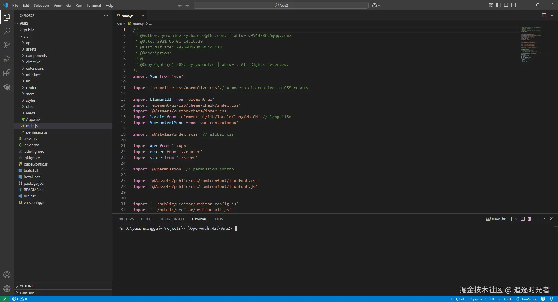 在 Vs Code 打开 OpenAuth.Net\Vue2 前端项目文件夹,如下图: