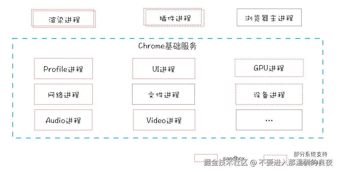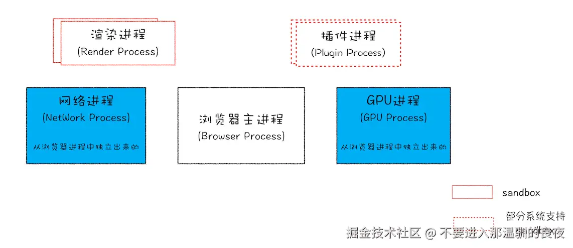 从图中可以看出,最新的 Chrome 浏览器包括:1 个浏览器(Browser)主进程、1 个 GPU 进程、1 个网络(NetWork)进程、多个渲染进程和多个插件进程。