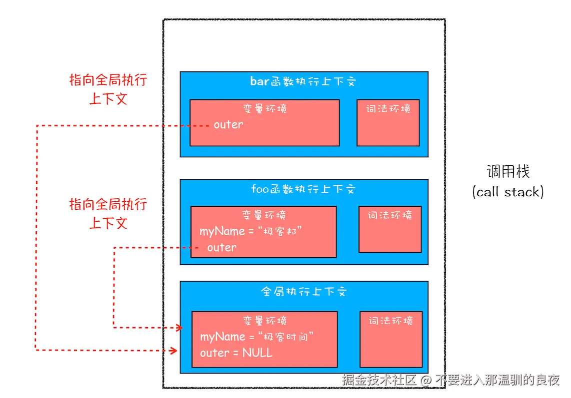 从图中可以看出,bar 函数和 foo 函数的 outer 都是指向全局上下文的,这也就意味着如果在 bar 函数或者 foo 函数中使用了外部变量,那么 JavaScript 引擎会去全局执行上下文中查找。我们把这个查找的链条就称为作用域链。