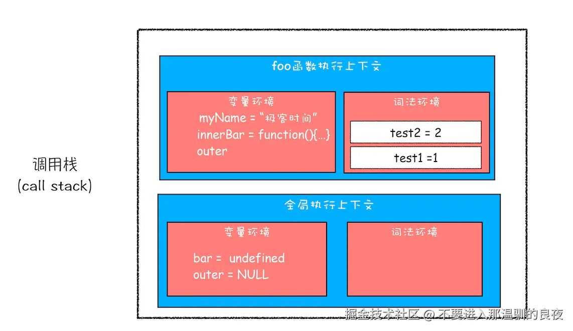 现在你知道变量是通过作用域链来查找的了,不过还有一个疑问没有解开,foo 函数调用的 bar 函数,那为什么 bar 函数的外部引用是全局执行上下文,而不是 foo 函数的执行上下文?