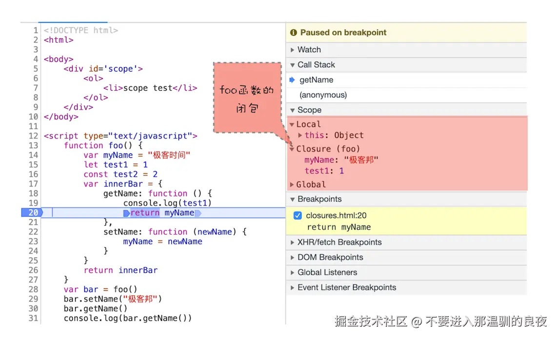 从上面的代码可以看出,innerBar 是一个对象,包含了 getName 和 setName 的两个方法(通常我们把对象内部的函数称为方法)。你可以看到,这两个方法都是在 foo 函数内部定义的,并且这两个方法内部都使用了 myName 和 test1 两个变量。