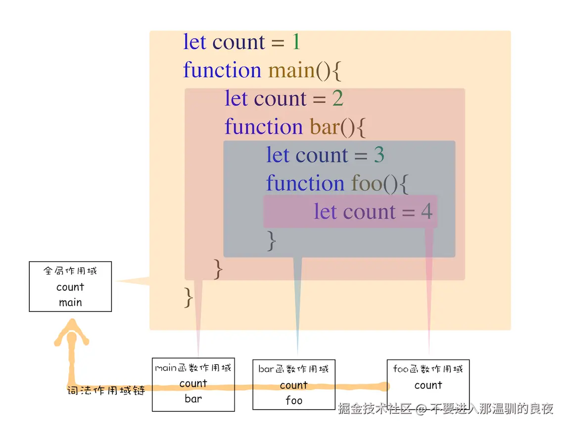 要回答这个问题,你还需要知道什么是词法作用域。这是因为在 JavaScript 执行过程中,其作用域链是由词法作用域决定的。