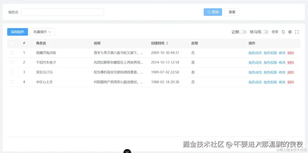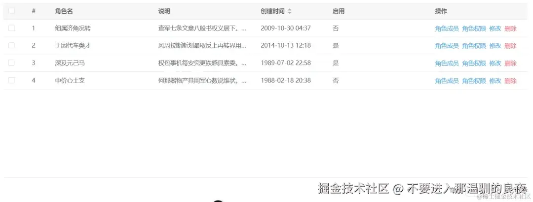 操作列角色成员,角色权限和修改,都需要打开一个抽屉界面(抽屉界面里的东西另算,不算在列表页中),删除需要调后端接口以及确认,因此