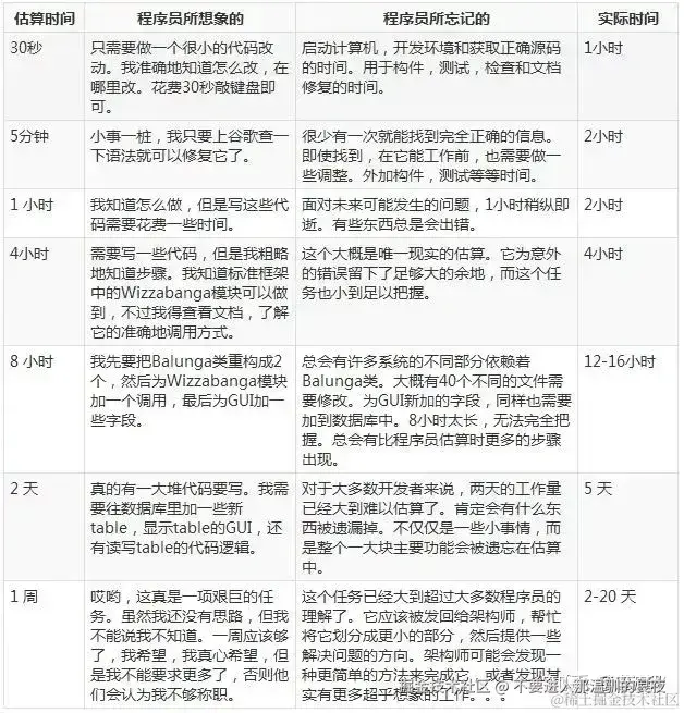 | 做个纯列表页面 | 前端只要把后端的字段显示出来就好了吧,肯定会很快 | 可能没有直接可用的组件,即使有,前端可能需要查组件文档,看具体用法, 还得处理loading状态,空状态,然后还得查看后端接口文档,看哪些字段需要额外处理,最后还得自测,甚至可能在真正对接前,需要自己造mock接口 | 2小时 | 8小时 |