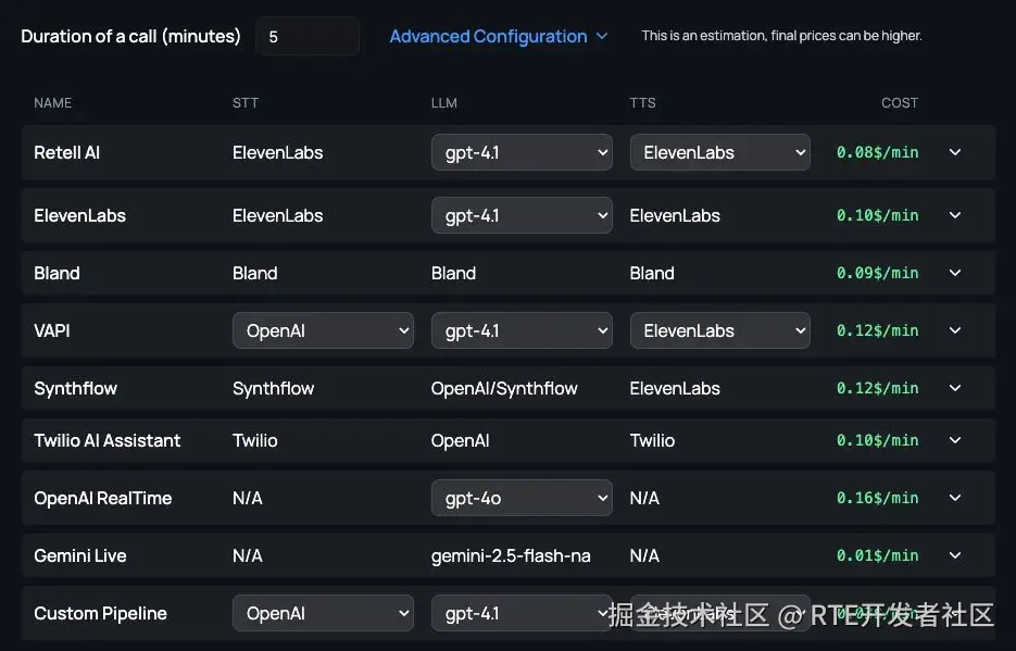 Voice Agents Cost Estimator 是一个用于估算运行语音智能体成本的工具,涵盖不同智能体提供商:包括对话式 AI 平台、实时语音模型和自定义 Pipeline 等。