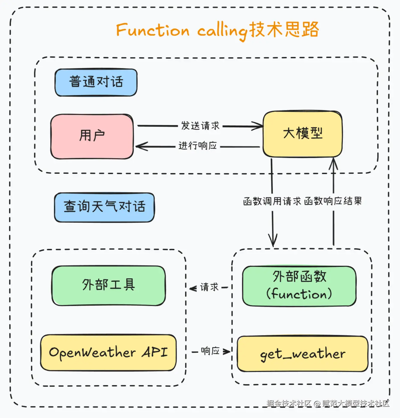 例如,当我们要查询当前天气时,让大模型调用外部工具的function calling的过程就如图所示: